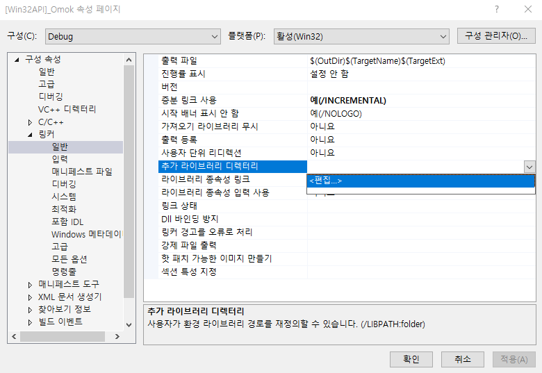 - 따라서 .lib가 있는 경로 전체와 .lib를 아래의 부분에 추가한다.