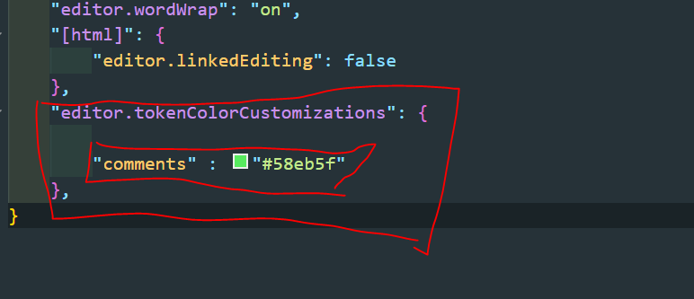4. 제일 하단 "editor.tokenColorCustomizations : { }" 안에 "comments" : "색상" 입력