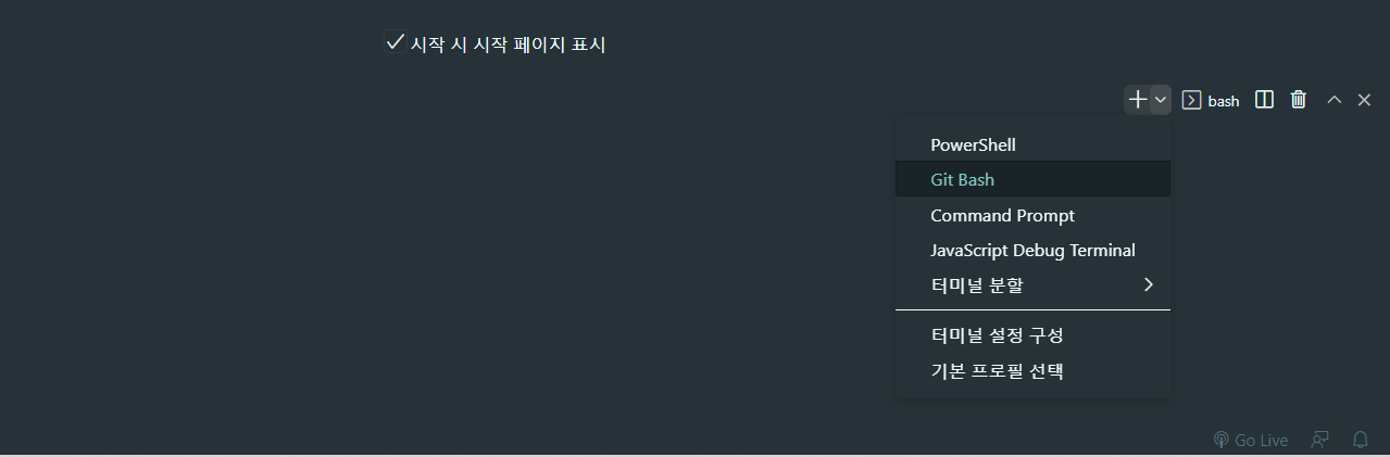 2. 열린 터미널 우측 하단에서 기본 터미널을 Git Bash로 수정한다.