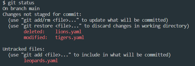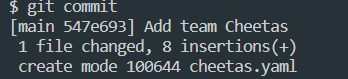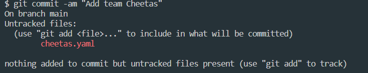cheetas.yaml이 untracked file(신규파일) 이기 때문에 git commit -am 시 오류나면서 안되는 모습