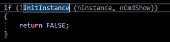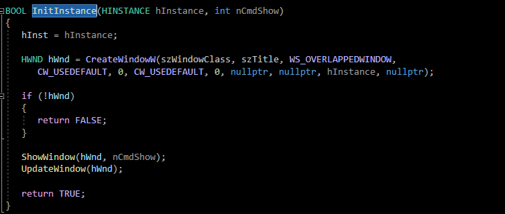 • 등록한 정보는 lpszClassName = szWindowClass; 을 통해 참조하여 사용함 (밑에 InitInstance()에서 사용한다)