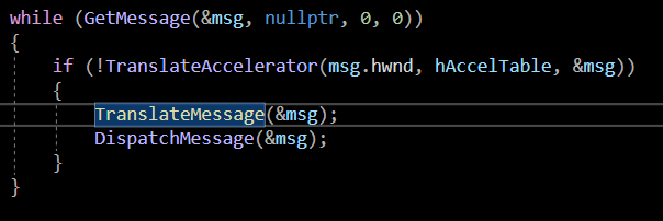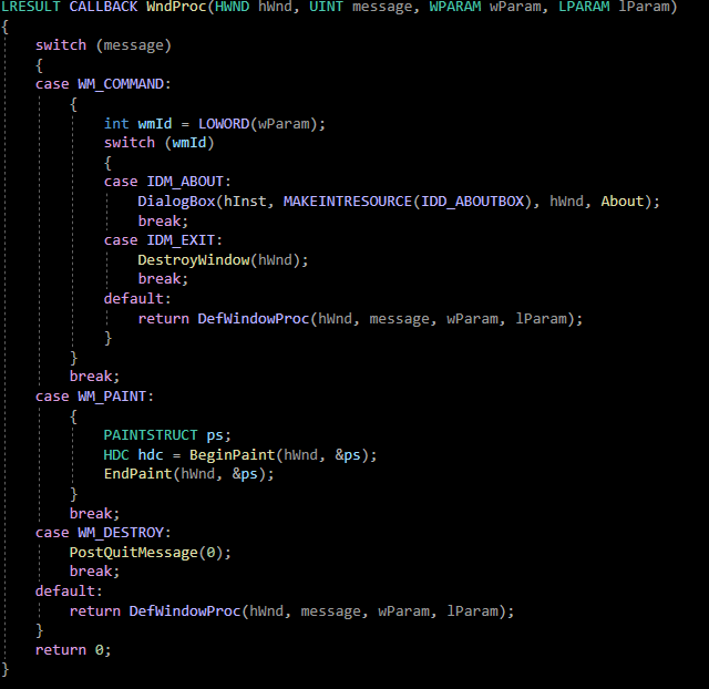 • 메시지가 발생하면 받아서 위의 MyRegisterClass()에서 등록했던 (wcex.lpfnWndProc = WndProc;) WndProc 함수에서 메시지를 받아 처리하게 된다.
