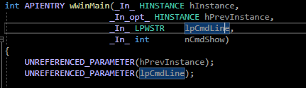 • 명령프롬프트로 실행 시 문자열을 주면 lpCmdLine 매개변수로 받아올 수 있음
