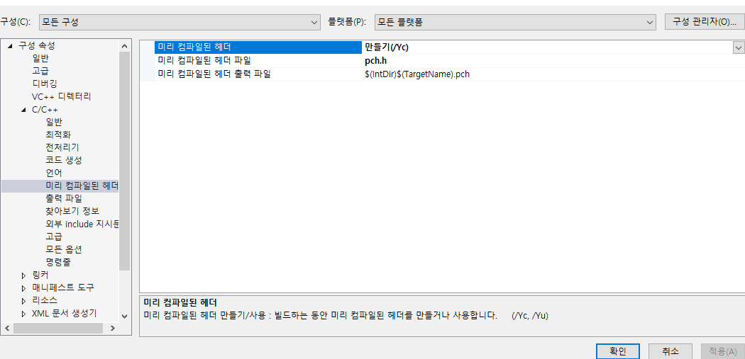 - 프로젝트 속성 - C/C++ 미리 컴파일된 헤더 - 만들기