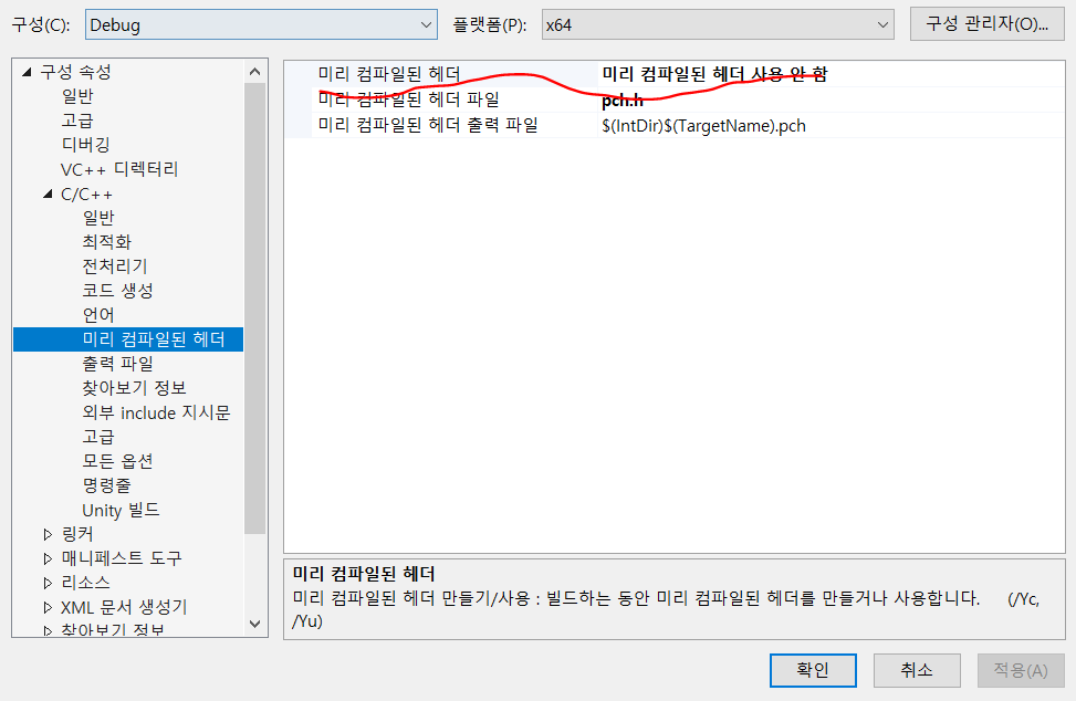미리 컴파일된 헤더의 경로 문제로 컴파일 오류가 발생할 수 있다.