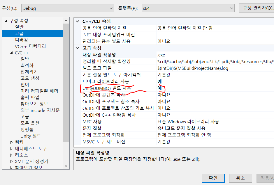 2019 이후 버전에서는 Unity Build를 지원하기 때문에 위와 같이 설정에 접근하여 Unity(JUMBO) 빌드 사용 활성화 하면