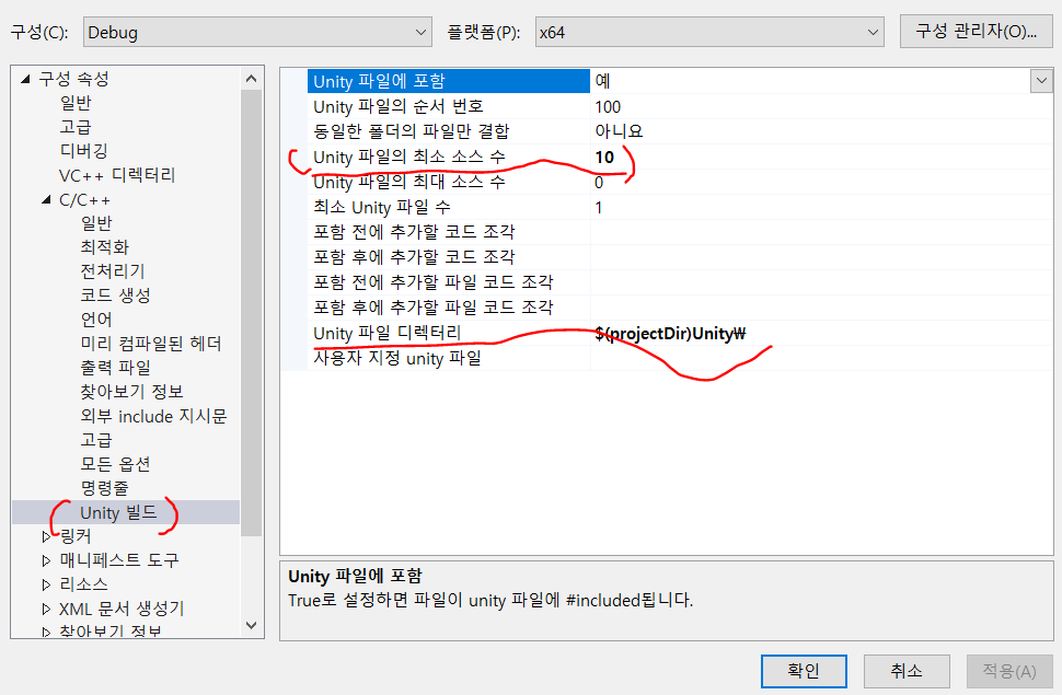 위의 그림처럼 C/C++의 Unity 빌드 설정이 생기고 안의 내용을 수정하여 사용하면 된다.