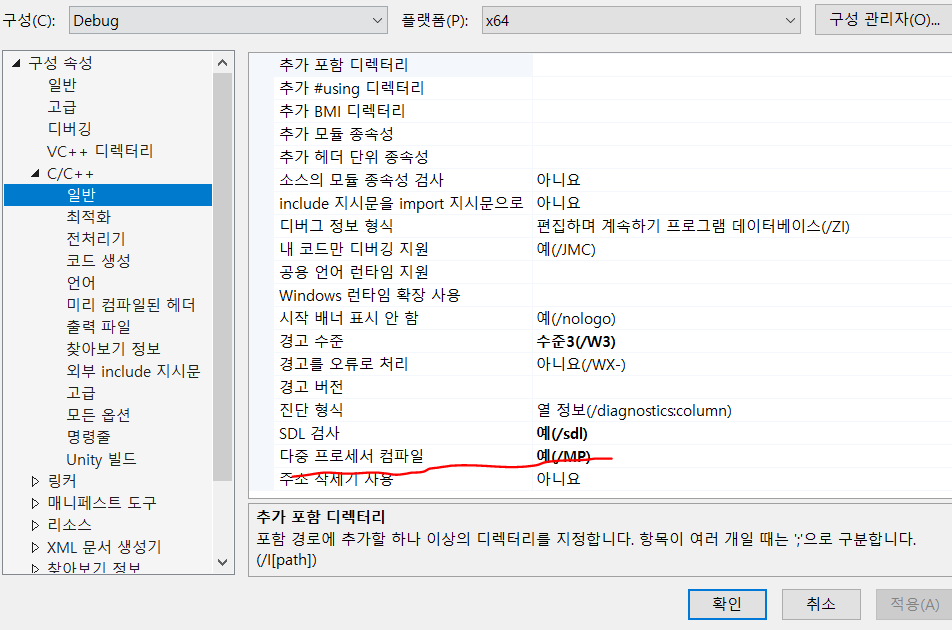 다중 프로세서 컴파일은 사용으로 해둬야 동작이 가능하다.